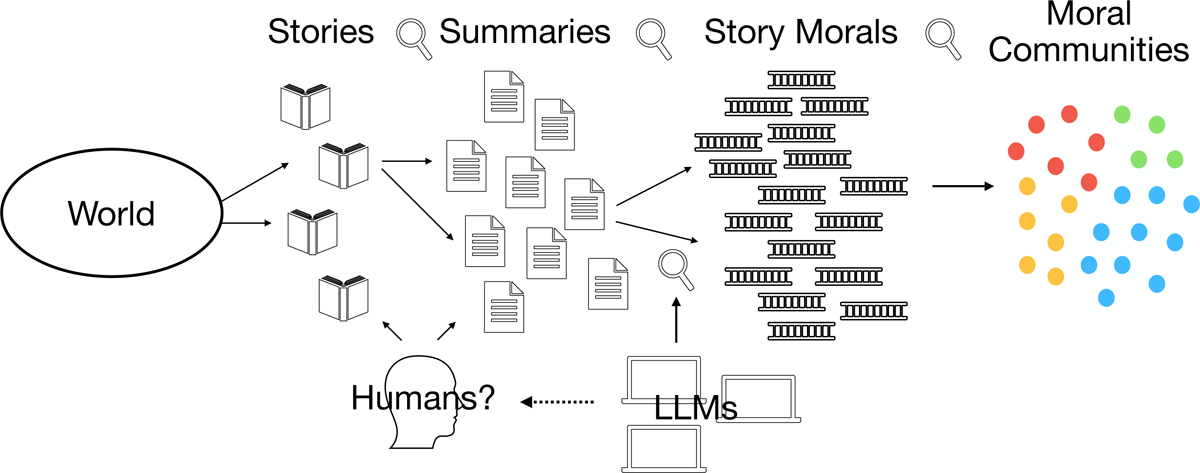 Hobson et al. (2024, 13000) have proposed and validated a workflow for story moral extraction using LLMs. In that work, the authors “define a ‘story moral’ as a general lesson that the narrator wishes to impart to the audience about the world“. Central to this concept is the focus on a higher order value: Lessons are meant to encourage or discourage certain behaviors, impart general wisdom to the reader, or influence their beliefs or worldview. Story morals understood as lessons mean that they are not strictly synonymous with the idea of moral “sentiments” (Vida et al. 2023). They focus instead on forms of behavior and belief that may be integrated into or derived from pre-existing moral frameworks but are not necessarily aligned with existing moral schemas.