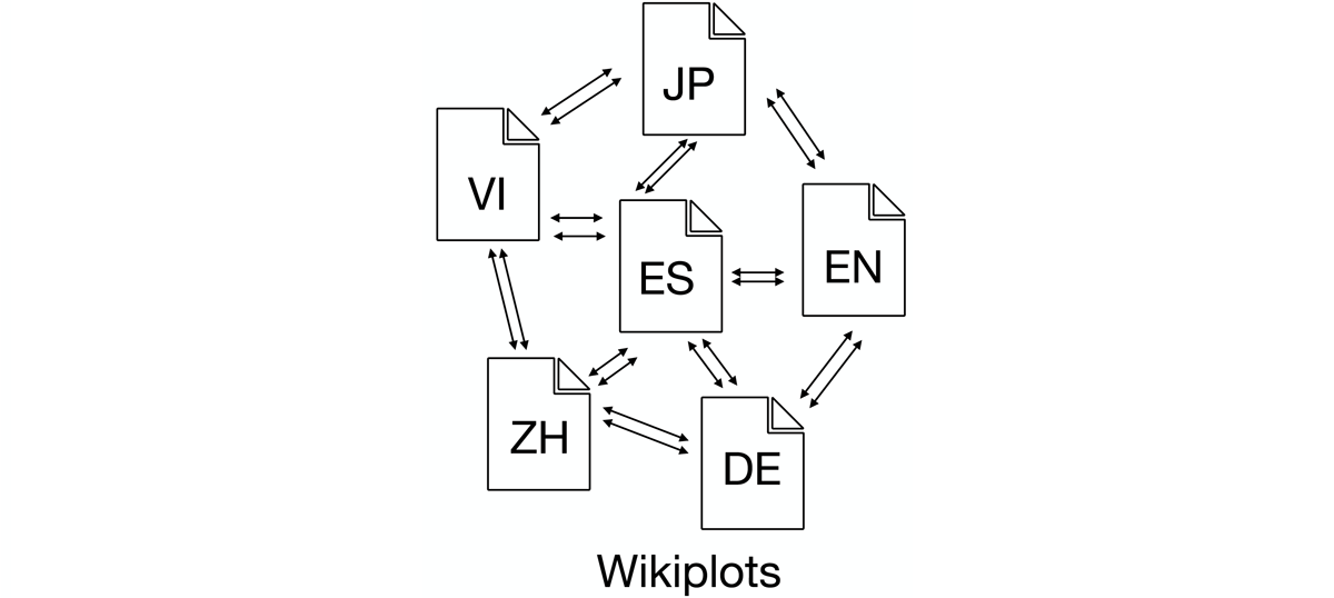 The second affordance of Wikidata is its multilingual and multicultural nature, i.e., the interconnected nature of cultural perspectives that it contains. Plot summaries contained in Wikidata provide insights into these cultural perspectives: both in terms of what works are chosen to be discussed and also in how the stories are reflected through the practice of summarization. Rather than provide a canonical summary of a canonical list of stories, Wikidata allows us to observe regional interpretations of story content through the practice of summarization and selection (Figure 2; Hatzel and Biemann 2024). Each language Wiki provides a perspective not only of its own cultural artifacts (English-language summaries of stories originally written in English) but also other cultures (English-language summaries of stories originally written in Japanse and vice versa). Wikidata allows us to move past the idealized ‘view from nowhere’ and instead contend with the idea of a ‘situated world literature’ (Cheah 2015; Figure 3).