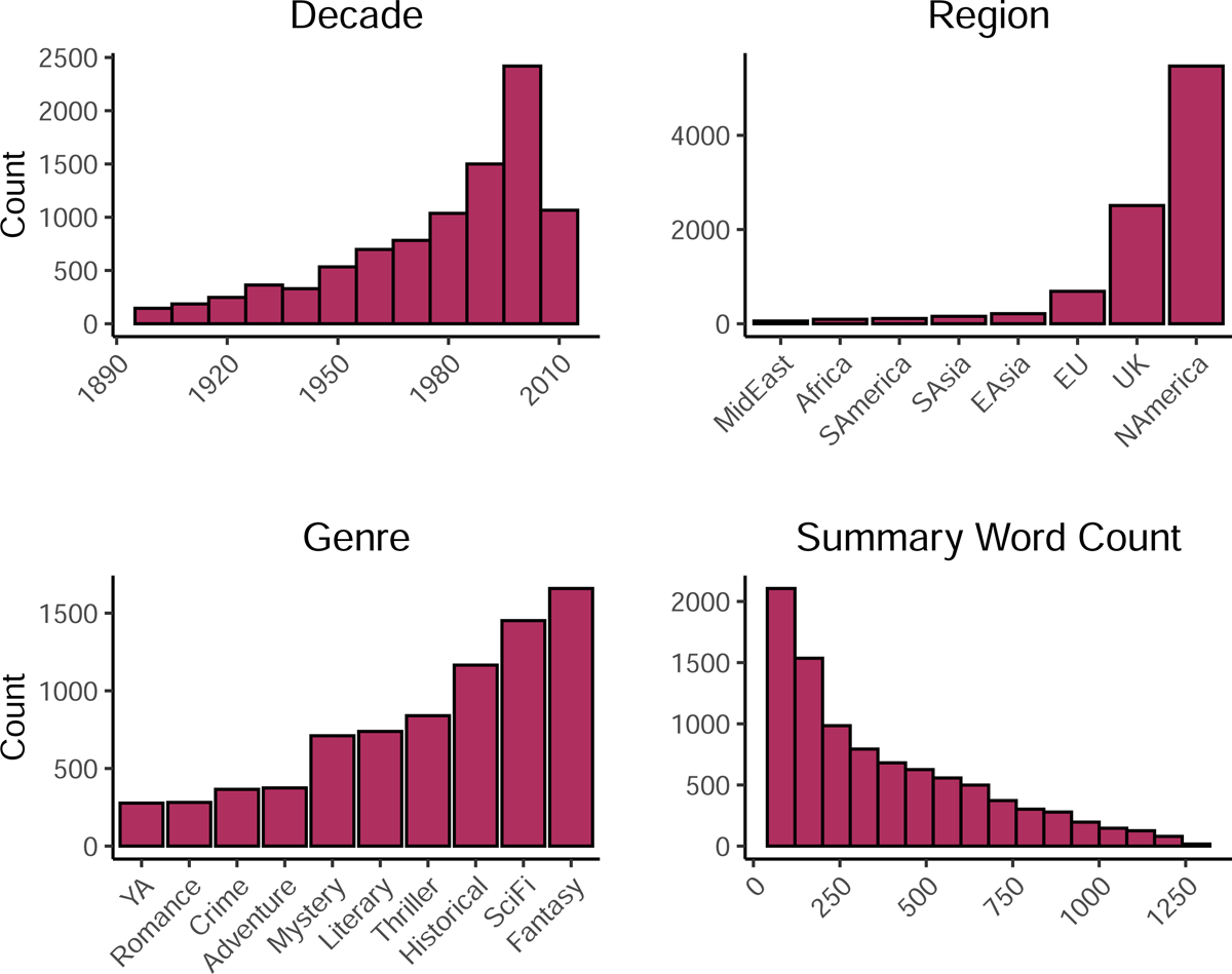For the purposes of this project, I use a collection of 9,756 human-written story summaries drawn from English-language Wikipedia for books published since the beginning of the twentieth century. These summaries are based on Mark Riedl’s Wikiplots dataset (Riedl 2024), which consists of 112,936 story plots extracted from any English language article that contains a sub-header that contains the word “plot” (e.g., “Plot,” “Plot Summary,” etc.). David Bamman has provided a filtered version of this data that subsets by “creative works” and “books” to capture the genre of novels (Bamman 2024). I further filter Bamman’s version by removing any entries where the summary field is less than 40 words or overly long (> 1,325 words). Additionally, I filter for only publications published after 1900, which represents the bulk of summaries in the data. This yields summaries representing novels published in 116 countries, with the vast majority from English-speaking countries. The average summary is 372 words long with an inter-quartile range of 130 to 556 words. This dataset is accessible in our data repository and hereafter referred to as ‘Wikiplots_Novel_EN.’ Figure 4 illustrates some descriptive statistics of the data.