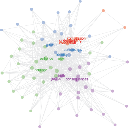 Figure 5 visualizes the co-occurrence network using a force-directed graph layout and Louvain community detection. I include the three most frequent labels for each community. The illustration helps us see greater clarity around the semantic associations of the different keywords along with larger frameworks to which they belong. If we take four communities as a reasonable estimate, we can infer high-level groupings around distinct areas of Truth/Justice, Resilience, Identity/Growth, and Compassion.