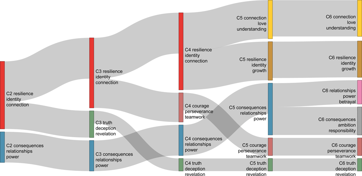 Figure 6: Hierarchical clustering of moral keywords visualized as a Sankey diagram. The diagram illustrates how clusters of moral concepts evolve across increasing levels of granularity, from k = 2 to k = 6. Each node represents a cluster of keywords identified through hierarchical clustering based on cosine distances between normalized co-occurrence vectors. Edges indicate how clusters at one level split into more fine-grained subgroups at the next. Nodes are labeled with the three most frequent keywords in each cluster. Cluster width reflects the average frequency of its top keywords.