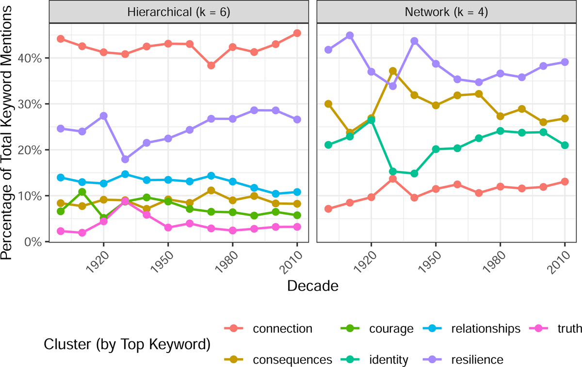 Finally, I analyze changes in the prominence of moral clusters over time by comparing their relative frequency across decades (Figure 7). Using both network-based (Louvain) and hierarchical clustering methods, each moral keyword is assigned to a cluster and its frequency is tracked as a proportion of all moral keyword mentions in a given decade. The resulting time series visualization reveals a striking degree of stability: Despite cultural and temporal shifts, the relative ordering of cluster prominence remains largely consistent within each method. Moreover, the comparison highlights important differences in semantic emphasis. In the hierarchical model, the cluster labeled by connection consistently dominates, suggesting a structurally central role for interpersonal and relational themes. By contrast, the network-based clustering foregrounds resilience as the most prominent and enduring cluster (with resilience second in the hierarchical model), pointing to a model of morality more centered on perseverance and individual strength. These contrasts illustrate how different modeling assumptions surface distinct moral contours within the same narrative data.
