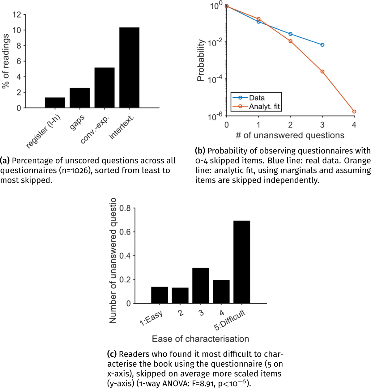 Finally, we asked whether item skipping exhibits a relationship to the last, reflective, question in the questionnaire, a scaled item in which readers were asked to report how easy it was for them to characterise the novel using the questionnaire. As seen in Figure 1c, the mean number of skipped items tends to increase when the reported difficulty in novel characterisation increases. Thus, an explicit report of ambivalence was statistically linked to an implicit one – the number of skipped scaled items, with readers reporting the maximal difficulty (5 vs. 1-4, post-hoc contrast after a one-way ANOVA test; ).