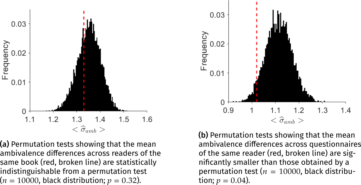 (2)We use as a measure for dis/agreement across readers of the same book about the degree of its ambivalence. If the identity of the book affects its ambivalence measures , then these values should, on average, be closer to each other, i.e. have a lower , than a random group of questionnaires of size nk relating to different books. To this end, we performed a permutation test. For each permutation, we randomly allocated the 272 questionnaires to arbitrary “book” groups of the same sizes , and calculated the permutation measures of disagreement . We repeated this permutation process times, and for each calculated the mean disagreement across all 65 “books”, which we mark by . We thus get a distribution of the mean disagreement under the null hypothesis that there is no significance for the real book grouping. To get a p-value, we calculate the fraction of sk that have values equal to, or smaller than, the mean disagreement measure of the real data,