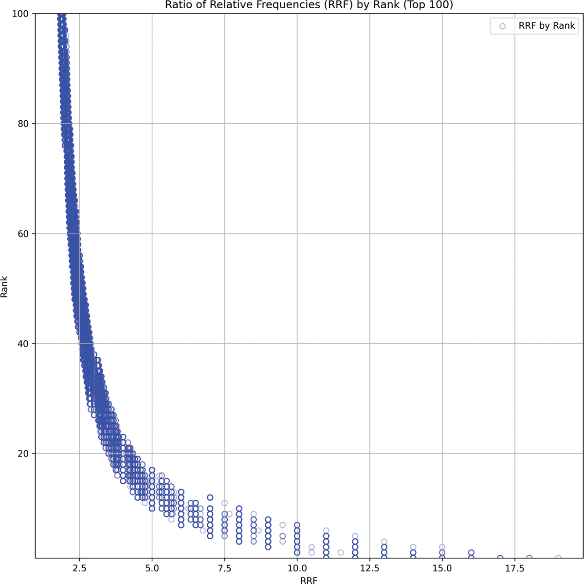 Figure 1 illustrates the relationship between rank and the Ratio of Relative Frequencies (RRF) scores, based on 100 runs of randomly sampled synthetic corpora. As shown, the first rank is typically achieved with RRF scores ranging from 10 to 18. This suggests that, due to the natural variations in the frequencies of existing words, an RRF score below 10 for the artificial word is unlikely to secure the first rank.