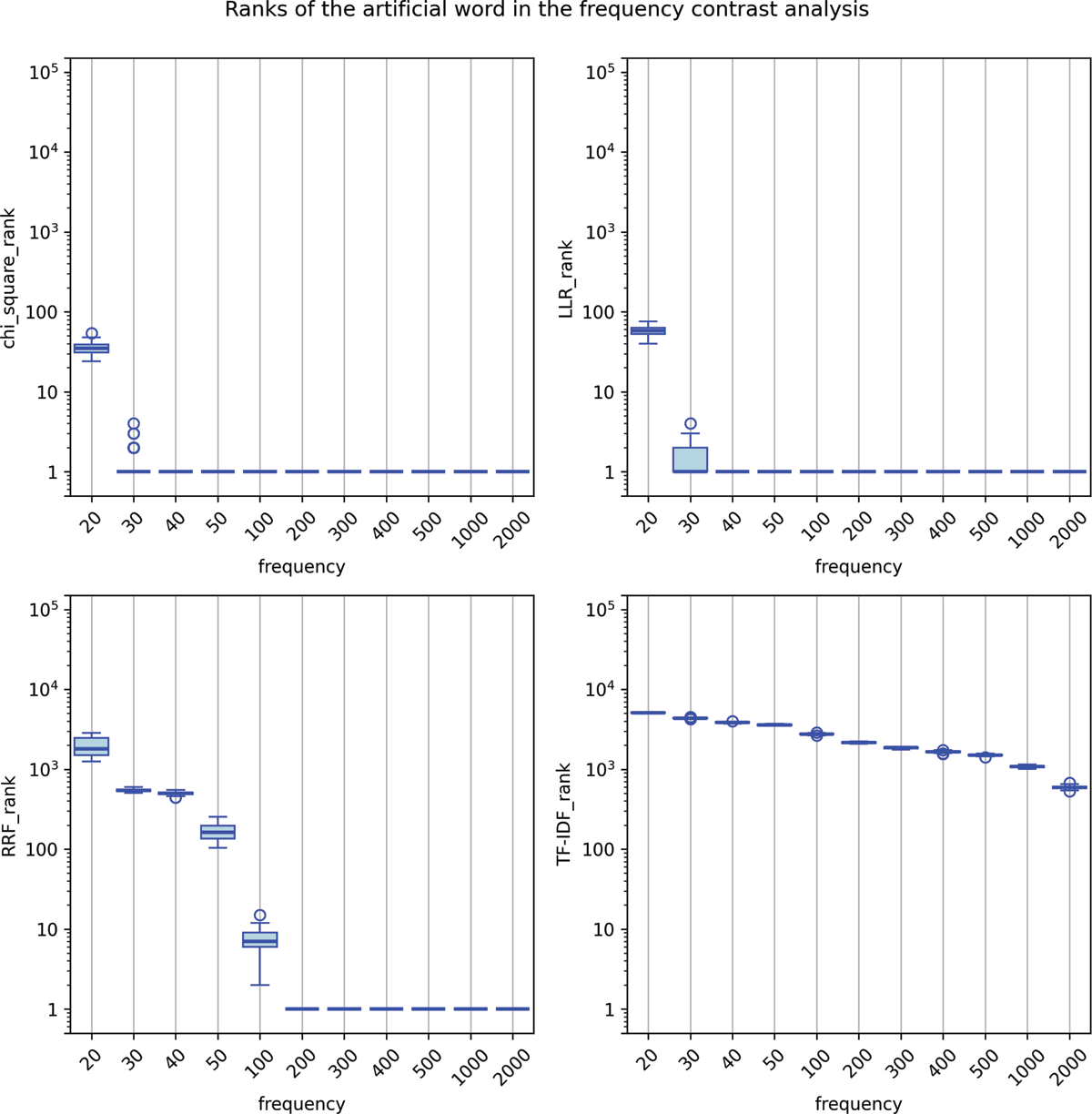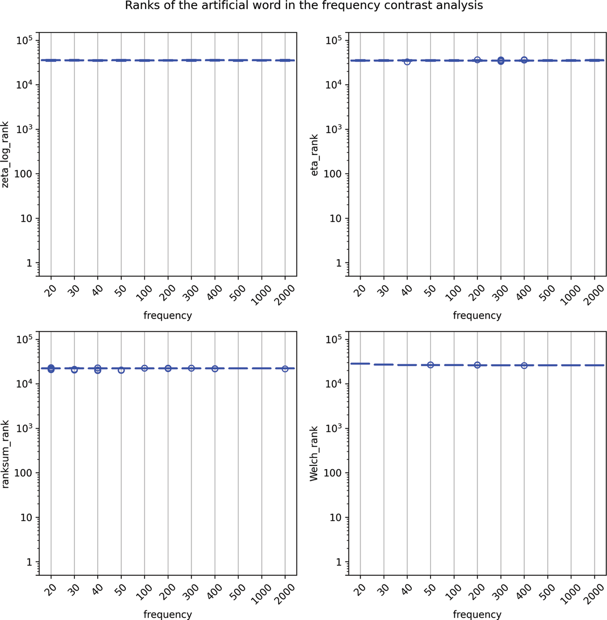 In the first setting, we added an artificial word to only one segment of the target and comparison corpus, albeit with varying frequency. This setting enables us to analyze the influence of only one parameter, namely the frequency. The frequency of the artificial word was set to 10 in the comparison corpus and remained constant there, while varying from 10 to 2,000 words in the target corpus. We used 12 different parameters for the frequency setting in the target corpus (10, 20, 30, 40, 50, 100, 200, 300, 400, 500, 1000, and 2000). For each parameter setting, pydistinto was run 100 times to mitigate the impact on the results of high scores for frequent words, which may arise as a result of variation that follows from the random sampling procedure and may in turn influence the distinctiveness score of an artificial word. The corpus was randomly divided into target and comparison parts at the level of the ‘novels’ for each run. Given the fact that texts were built by randomly sampling words from the entire corpus, and the two subcorpora were built by randomly sampling ‘novels’ from among all ‘novels’, any difference between the target and comparison corpora, apart from the artificial word, can only be due to random variation.
