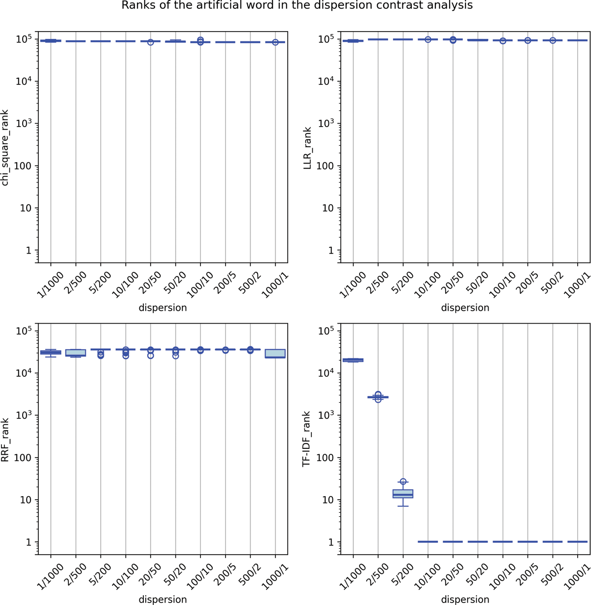 The objective of our analysis is to assess the hidden properties and limitations of the measures of distinctiveness in identifying distinctive words. This is achieved by applying each measure to a homogeneous synthetic corpus to which an artificial word with a controlled frequency and dispersion has been added. Systematically varying the frequency and dispersion of this word, and observing how its keyness rank in the results varies as a result, shows us to what degree a given keyness measure is sensitive to differences in frequency and/or dispersion. We chose to compare the ranks, rather than the measures’ scores, for better comparability.