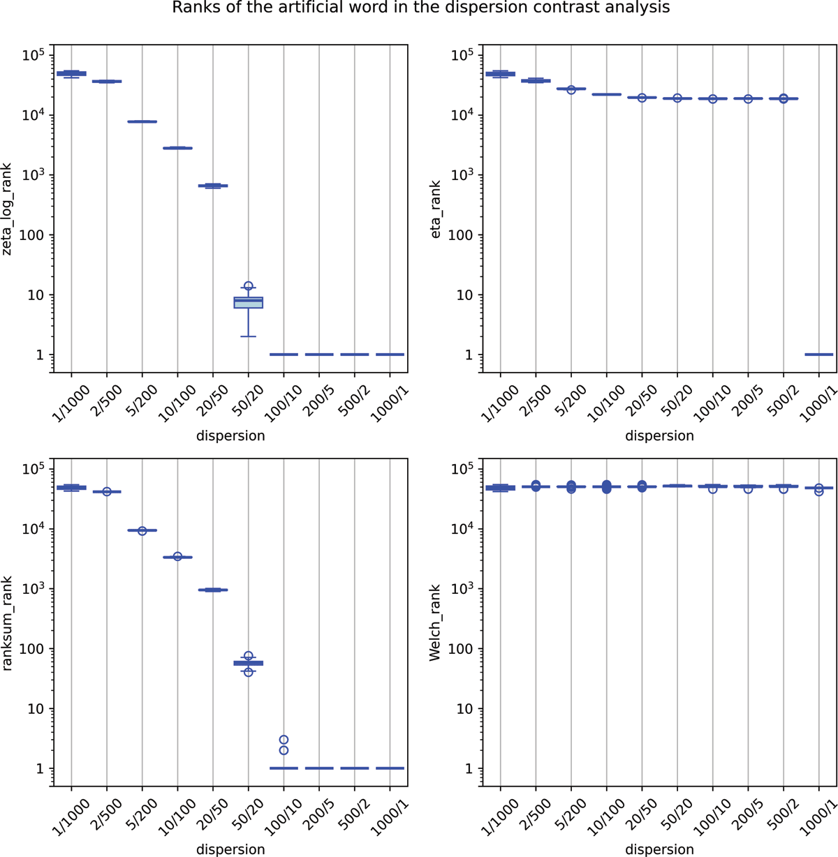 Figure 5 shows results for dispersion variations with the measures Zeta_log, Eta, ranksum and Welch. An interesting result was obtained by Eta. As it is a dispersion-based measure, we expected Eta to effectively identify an artificial word as distinctive, especially when the word is evenly spread across a high number of segments. However, as the number of segments containing the artificial word in the target corpus increases, its scores remain consistently low compared to randomly assigned words. Only in the most extreme setting, with one occurrence in 1,000 segments in the target corpus, the artificial word receives the top rank (Figure 5).